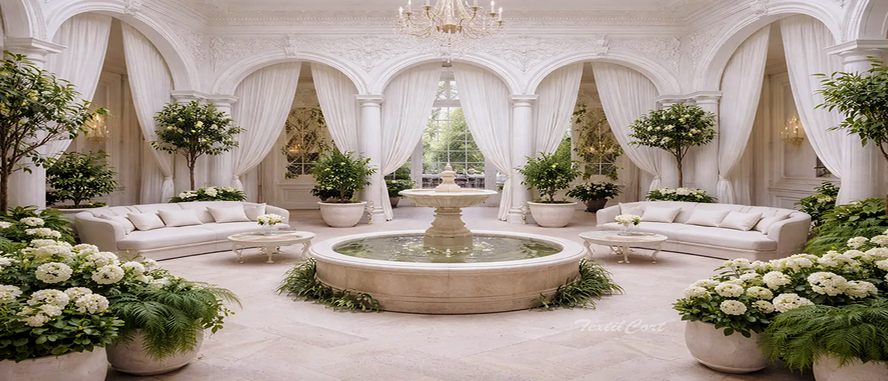 - Materiales como seda, terciopelo, jacquard, damasco y visillos vaporosos de alta calidad.