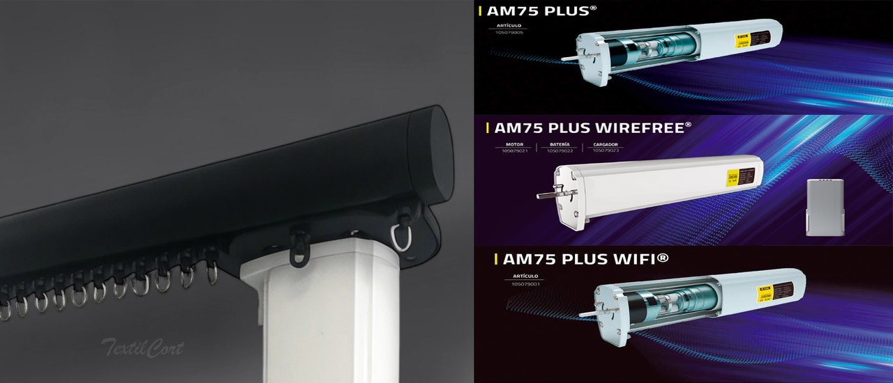 Este riel se puede equipar con tres motorizaciones distintas: AOK, Eurotronic o Sofmy. Con la motorización AOK, es posible controlar las cortinas mediante mando a distancia, Wi-Fi, smartphone, pulsador de pared o sistemas de domótica, incluso combinando todas las opciones al mismo tiempo.